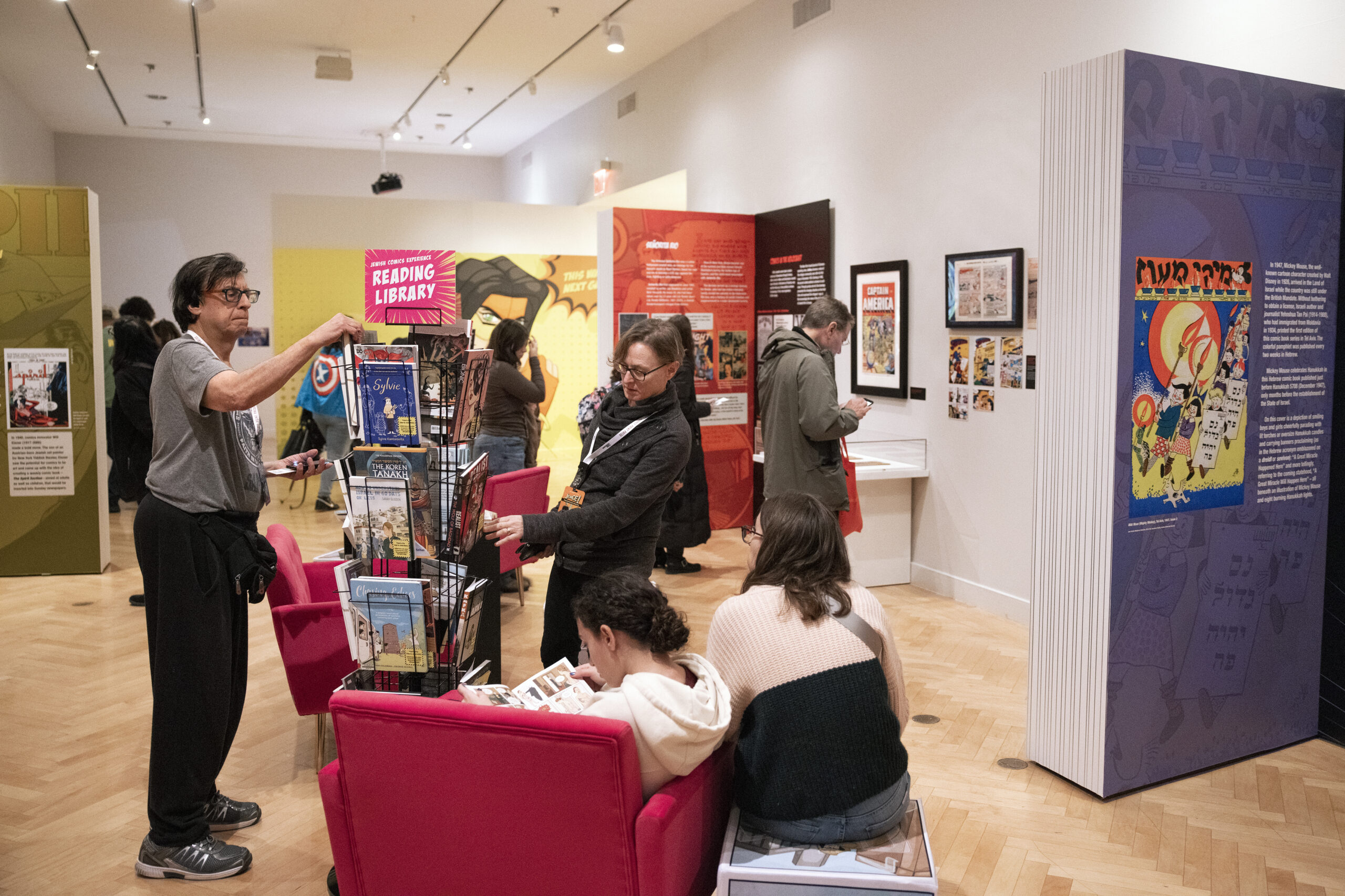 The exhibition features original artworks, rare archival pieces, and historical artifacts spanning from classic newspaper strips to contemporary graphic novels, highlighting iconic characters, stories, and creators. Visitors explore five distinct micro-exhibits that capture historic moments in the medium, including The Jewish Origins of the Comic Book Industry, Fighting Fascism, A Brief History of Yiddish Comics, Sephardi Identity and Memory in Comics, and Mickey Mouse and Ashmedai: Hebrew Children’s Publications at a Momentous Time, 1945-48.