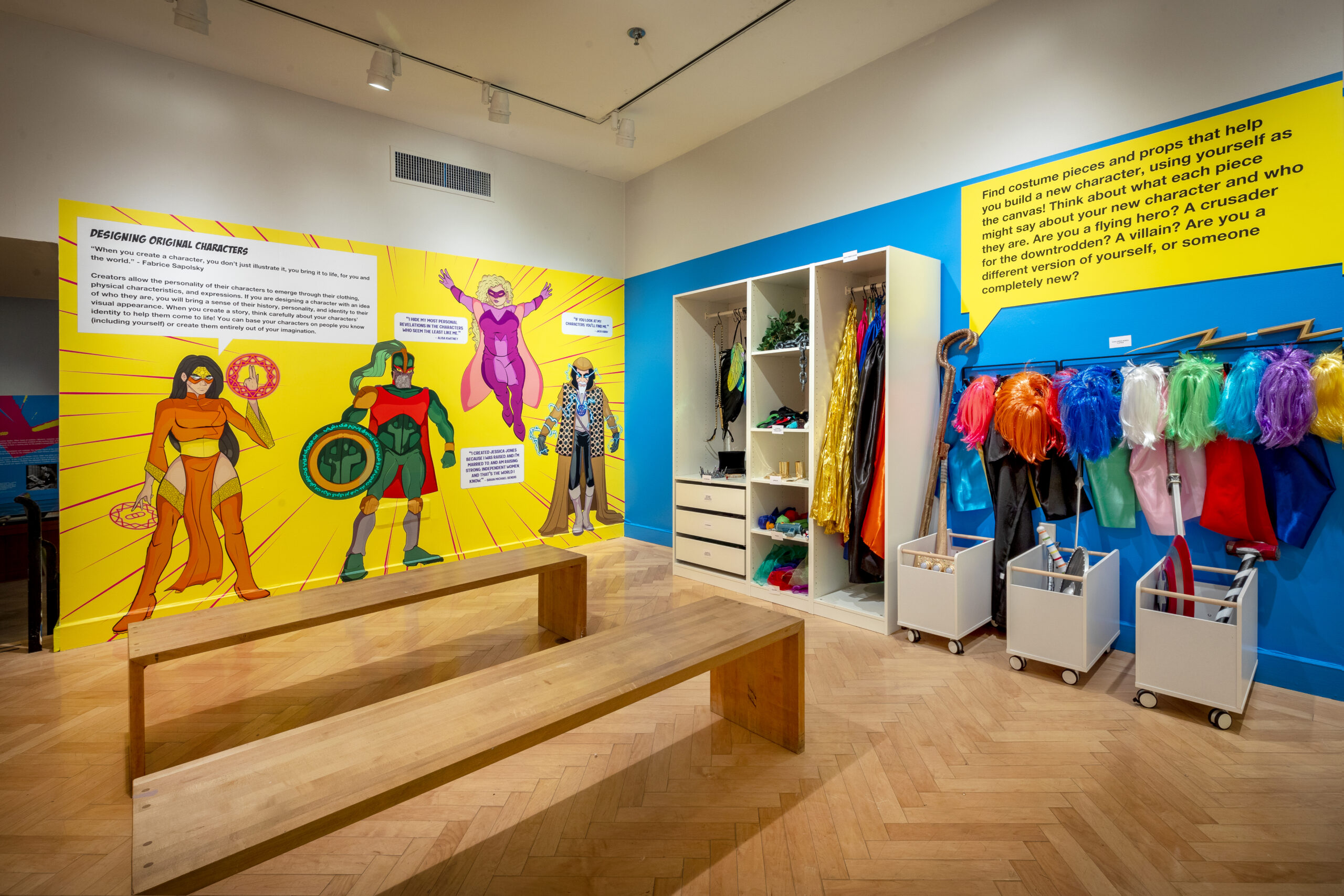 This exhibit also features a “comics laboratory”; an immersive area where visitors of all ages are invited to craft a comic book character through hands-on play with costumes and props. From Superman and Magneto to Captain American and Fantastic Four’s Thing, visitors also learn the elements of sequential art and are instructed in the use of iconography to tell stories. By engaging with the tools of the form, visitors immerse themselves in the process of making comics.